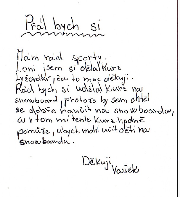 Vašek je aktivní fotbalista. Sport pro něj znamená život - představuje důležitý prostor pro seberealizaci, možnost vnímání své síly, svých možností, radost a přátelství. Baví ho proces zlepšování a ví, že díky pravidelné práci na sobě může své dovednosti dále rozvíjet. Je spolehlivý, akční, hovorný, vtipný, přátelský a v kolektivu oblíbený, díky své přirozené autoritě. Rád se aktivně podílí na tvorbě a realizaci programu pro rodinou skupinu. Vašek je také aktivním členem dětské redakce časopisu Zámeček, kam pravidelně přispívá reportážemi ze sportovních akcí, čímž může ostatní inspirovat ke sportování.