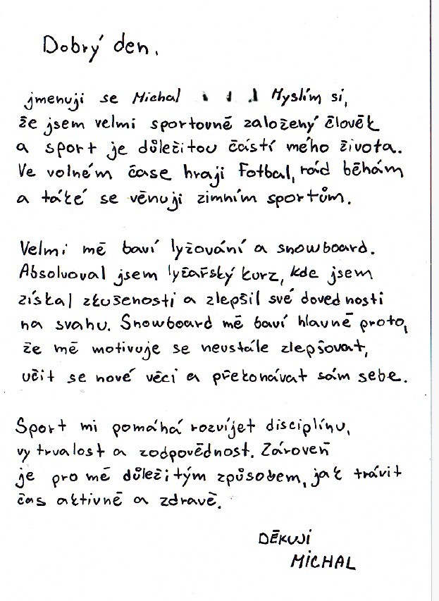 Michal je aktivní fotbalista a sport hraje v jeho životě důležitou roli. Kromě fotbalu se věnuje také běhání, posilovnání a je celkově všestranně orientovaný. Baví ho jízda na snowboardu a rád by se dále zdokonaloval v technice i získal oprávnění k výuce snowboardingu. Je oblíbený, respektovaný a opora týmu. Je to stabilizující člen kolektivu, s vůdčími schopnostmi. Své schopnosti prokázal během pobytu na horách, kde pod naším dohledem pomáhal s výukou dětí, protože má absolvovaný instruktorský kurz lyžování. Je za něj velmi rád a rád by své kompetence dále rozšiřoval.